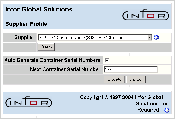 If you check the box to generate the serial numbers automatically, then you must enter the first serial number in the sequence. The value in the Next Container Serial Number field will be updated by the system as further serial numbers are generated.